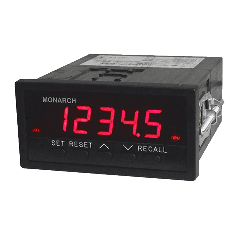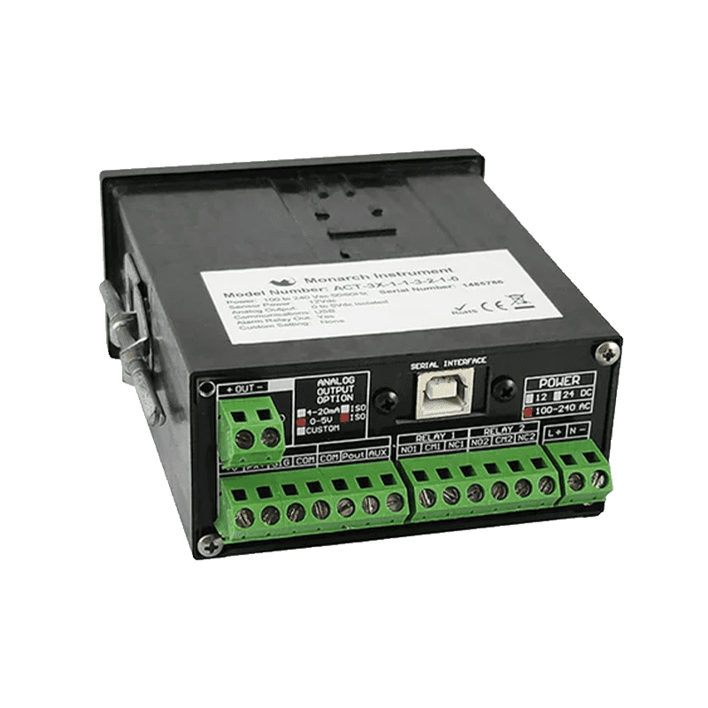 The ACT-3X Programmable Tachometer and Totalizer is a versatile and compact device designed for precision speed measurement and counting applications. Featuring a 1/8 DIN size with a clear 5-digit LED display, it offers a wide speed range from 5 to 999,990 RPM, accommodating various industrial needs. This NIST calibrated instrument accepts inputs from Monarch speed sensors or any standard TTL generating device, providing flexibility for diverse applications. Programming is user-friendly through front panel pushbuttons or the optional PM Remote Software, allowing for easy customization. The software enables real-time data viewing on a PC, data storage in Excel files, and remote configuration. With universal AC power compatibility (100-240 V ac) or optional 12/24 V dc input, the ACT-3X suits various power requirements. Optional output configurations include 4-20 mA or 0-5 V dc, providing scalable outputs for interface with other systems. It finds applications in process monitoring, research and development, engine performance analysis, and predictive maintenance, among others. The ACT-3X supports a broad speed range with programmable scaling, accurate readings with ±0.001% precision, and a high-resolution 5-digit LED display. It offers versatile input options, including universal inputs for optical, proximity, magnetic, infrared, or laser sensors, making it adaptable to different sensing technologies.
