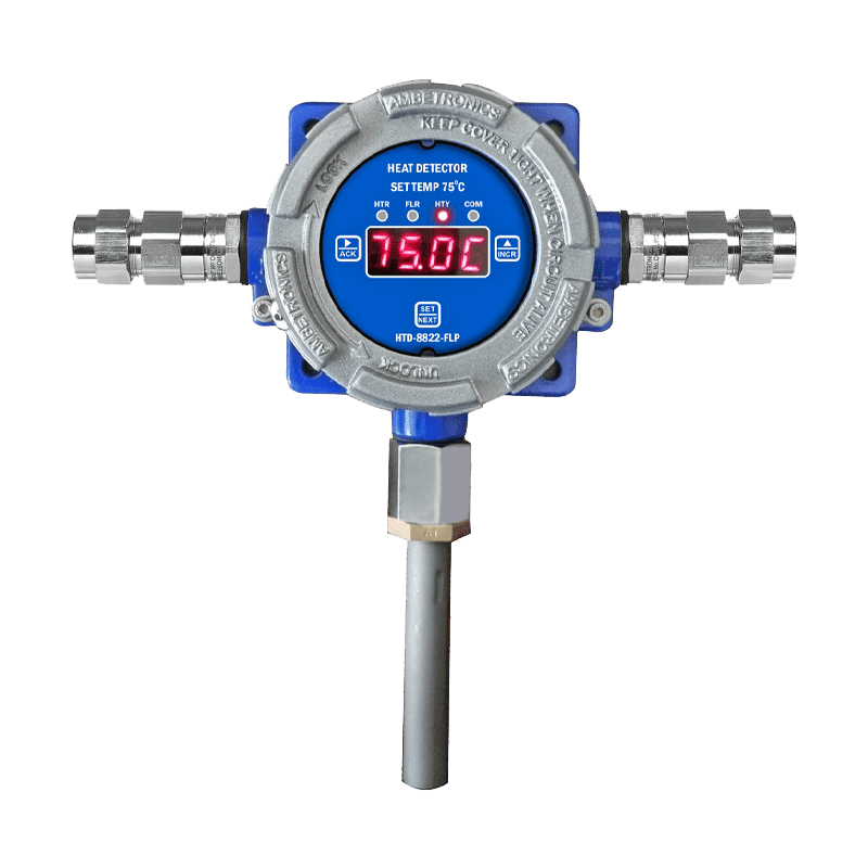 The HTD-8822-FLP Heat Detector is a sophisticated and reliable thermal detection device designed to sense overheating or fire through temperature rise in various applications. This Micro-Controller based detector offers a fast and accurate response to heat build-up in ambient temperature, providing a crucial alarm signal to alert the system and trigger precautionary measures. Factory preset to customer-specified temperatures between 40°C to 210°C, the detector features auto-reset functionality, low power consumption, and seamless communication with the GDS-416 system. With a fixed temperature, rate-compensated thermal detection technique, the HTD-8822-FLP is suitable for diverse environments such as heat treatment plants, burner/furnace/boiler areas, oil & gas industries, and more. Its performance is marked by a rapid response time of less than 60 seconds. The electrical aspects include a supply voltage range of 18 to 36 VDC, consuming less than 3W power. The detector utilizes flexible or armored shielded cables for wiring, supporting both Class A and Class B looping.