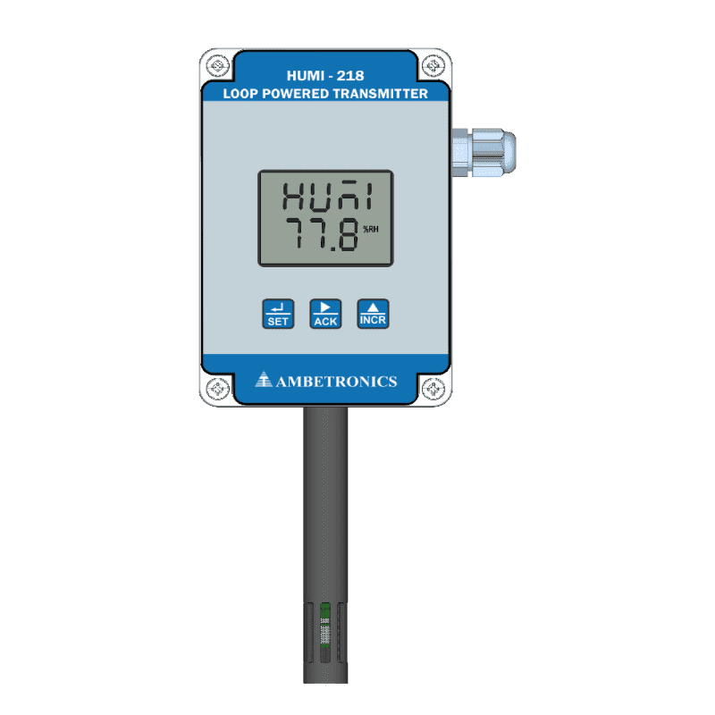Enhance environmental monitoring with the Loop Powered Humidity Transmitter HUMI-218 by Ambetronics. Utilizing advanced CMOS sensor technology, this transmitter provides highly accurate humidity readings in the range of 0 to 100% RH with a resolution of 0.1. The 2-line, 4×2 LCD display ensures clear visibility of humidity levels, while the device offers two independent alarm set points for indication purposes.