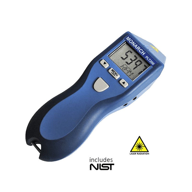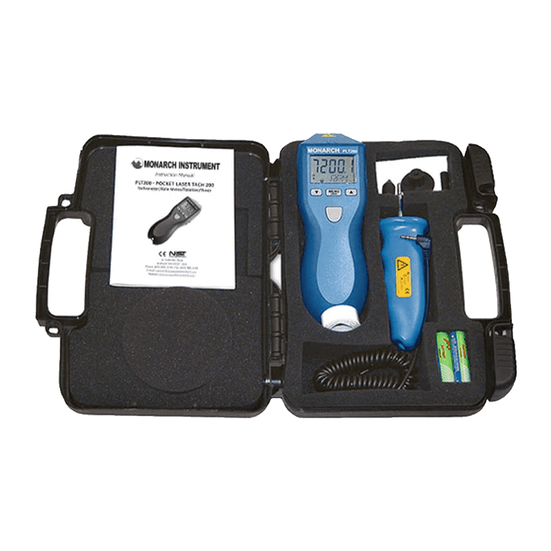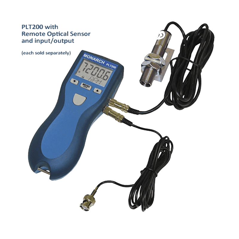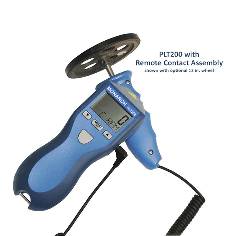The Pocket Laser Tach PLT200 is a versatile and portable optical tachometer designed for precise RPM measurements up to 25 feet away from a reflective target using a Class 2 visible laser. Its ergonomic design allows safe and direct line-of-sight viewing of both the target and the 32-function display simultaneously, featuring an easy-to-read dual LCD with a 5-digit upper scrolling and 5-digit alphanumeric lower display. This digital tachometer offers flexibility with optional accessories, such as the Remote Contact Assembly (RCA) for measuring various units like revs, inches, feet, yards, centimeters, and meters. The RCA includes concave and convex tips and a 10 cm linear contact wheel, expanding the tachometer’s capabilities to measure rates in different units per second, per minute, or per hour, as well as miles per hour.