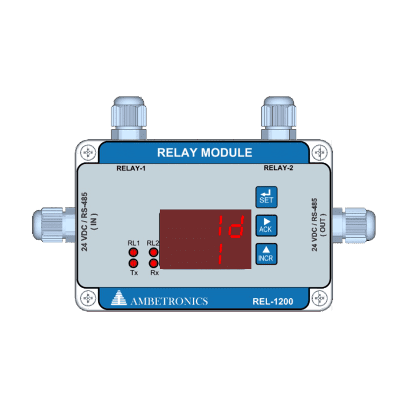 The REL-1200 Relay Module is a versatile and user-friendly device featuring microcontroller-based programming and password protection. Designed with a focus on ease of use, it offers a 4-digit 7-segment display for configuration within the ABS plastic box. The module supports MODBUS-RTU Protocol over an isolated RS-485 Communication Port, allowing selectable slave addresses and programmable settings such as baud rate, parity, data bits, and stop bits. With 2 SPDT relays for each channel, the REL-1200 provides flexible relay logic options, including Normally On, Pulse On, Normally Off, and Pulsating On & Off. Programming is facilitated by three push-button keys, ensuring security with password protection. The module operates on a 24VDC supply with a low wattage of less than 3 watts, making it energy-efficient. Its environmental specifications include an operating temperature range of 0 to 50°C and a humidity tolerance of below 90% Rh (non-condensing). The module’s compact dimensions (100mm x 160mm x 55mm) and IP-65 protection class make it suitable for wall mounting in diverse applications.