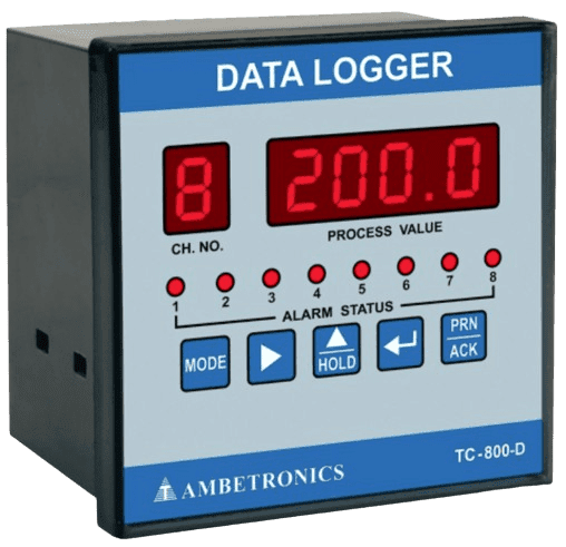 The TC-800D-PM Data Logger employs advanced microcontroller technology, ensuring precise measurements across 8 fixed input channels support a variety of thermocouples (J, K, R, S, T, E, B, N), RTD (PT-100), and either 4-20mA, or 0-10 VDC, offering versatility in data collection as per customer requirement  . Featuring online field calibration, the device allows easy customization of channel scan times and logging intervals. It offers optional RS-485/RS-232 Modbus Serial Ports, automatic cold junction compensation, and temperature readings in both °C and °F. With applications ranging from ISO certification records to pharmaceutical process validation and furnace heat profiling, this logger excels in diverse monitoring scenarios. The panel-mount design, equipped with a membrane keypad, supports convenient on-site adjustments. The IP-65 rated housing ensures durability in challenging environments, making it an ideal choice for critical data recording in industrial and hazardous areas. Optional features include isolated serial ports, data acquisition software, and individual or grouped relay outputs for each channel. With a compact size of 96mm x 96mm x 175mm, the TC-800D-PM Data Logger offers a reliable solution for comprehensive temperature monitoring.